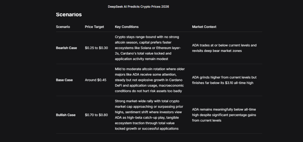 Starting from the current zone near $0.29, DeepSeek AI generated three scenarios based on ADA’s history of large cycle swings.