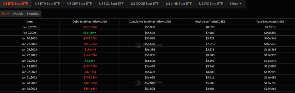 According to data from SosoValue, U.S.-Listed spot bitcoin ETFs recorded roughly $272 million in net outflows on February 3rd, as BTC briefly dropped to $73k. These outflows extend the recent pattern of withdrawal amid surging volatility. Since January 16, spot BTC ETFs have recorded inflows only twice.