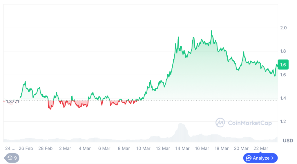 Tracking BTC’s recovery on a 106% volume spike, RNDR layered up above 1.8% to head toward $1.68. The price held above its 7-day moving average at $1.65, while MACD went positive.