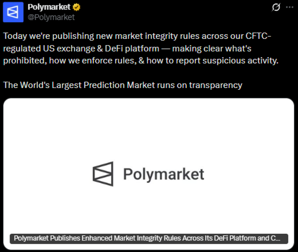 On March 23, Polymarket announced updated market integrity rules, affecting its global DeFi platform and its US CFTC-regulated exchange.