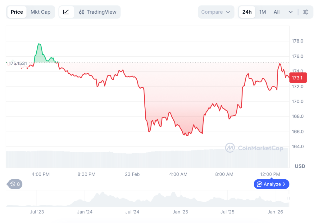 Grayscale filing an S-1 for a Bittensor Trust has brought the institutional credibility that few AI tokens can claim to Bittensor this February, and now, TAO is near $173, down above 5% on the day as altcoin weakness swept across the board.