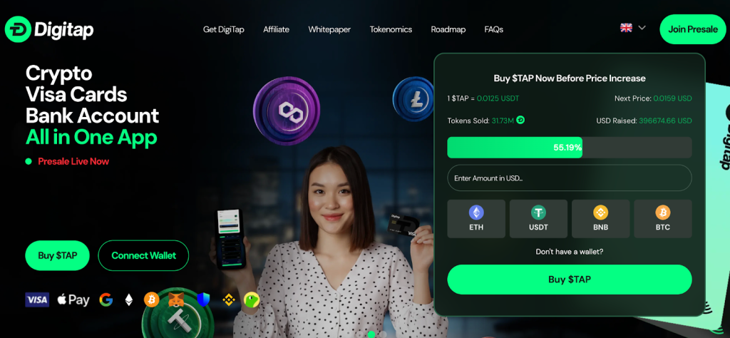 Digitap ($TAP) positions itself at the heart of this trend. The world’s first omni-bank, Digitap, aims to combine blockchain with mainstream finance. With 124% APY staking, a buyback and burn system, and Visa and Apple Pay integration, analysts are debating whether $TAP could reach $3 by 2025. A growth to $3 would constitute a more than 150x from its current $0.0125 price.