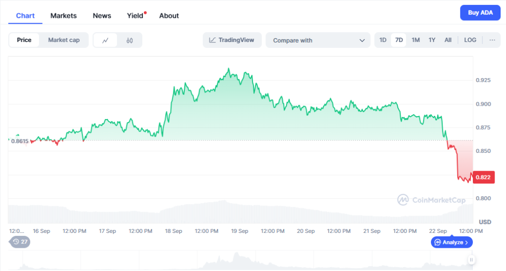 The Cardano price has witnessed a massive pullback, following $220 billion in liquidation across the crypto market. The value of ADA has plummeted by 7.9% on the 7D chart, per CoinMarketCap, falling to $0.81.
