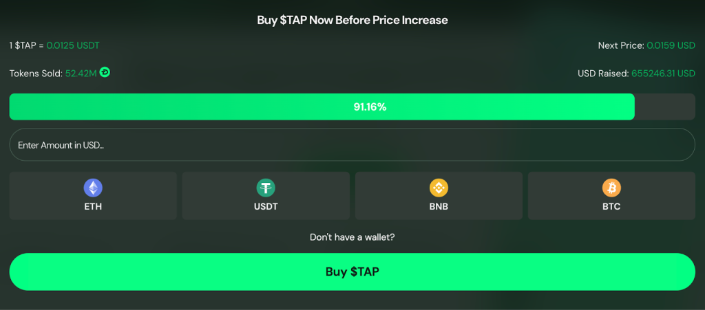 From there, continued adoption—driven by card usage, remittance volume, and merchant integration—could move $TAP toward $0.10–$0.30 within its first year. The long-term projection of $0.90, roughly a 75× gain, assumes a 12- to 24-month horizon supported by ongoing user growth and liquidity expansion.
