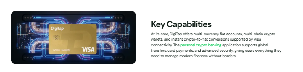 Rather than a base-layer blockchain like Solana, Digitap is a consumer-first “omni-bank” app that unifies fiat banking services with crypto capabilities. The platform is already live on iOS and Android devices and can also be accessed via a web browser. Users can send, receive, store, save, and invest in more than 20 fiat currencies and over 100 cryptocurrencies.