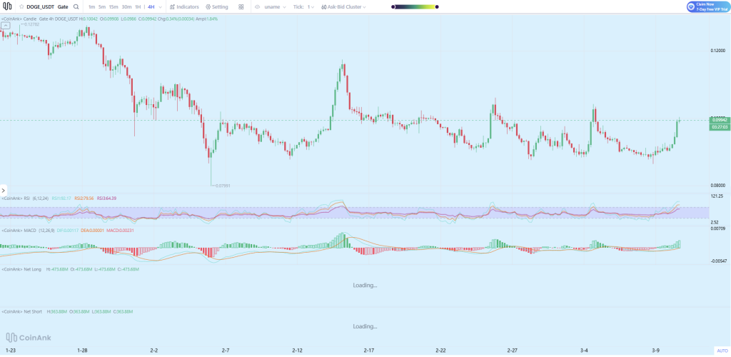 The daily chart shows DOGE bouncing off support near $0.08 and making its way higher. That $0.08 area has held multiple times, with buyers stepping in each time the price dropped. The current pump brought DOGE to $0.0985, right below that psychological $0.10 level.