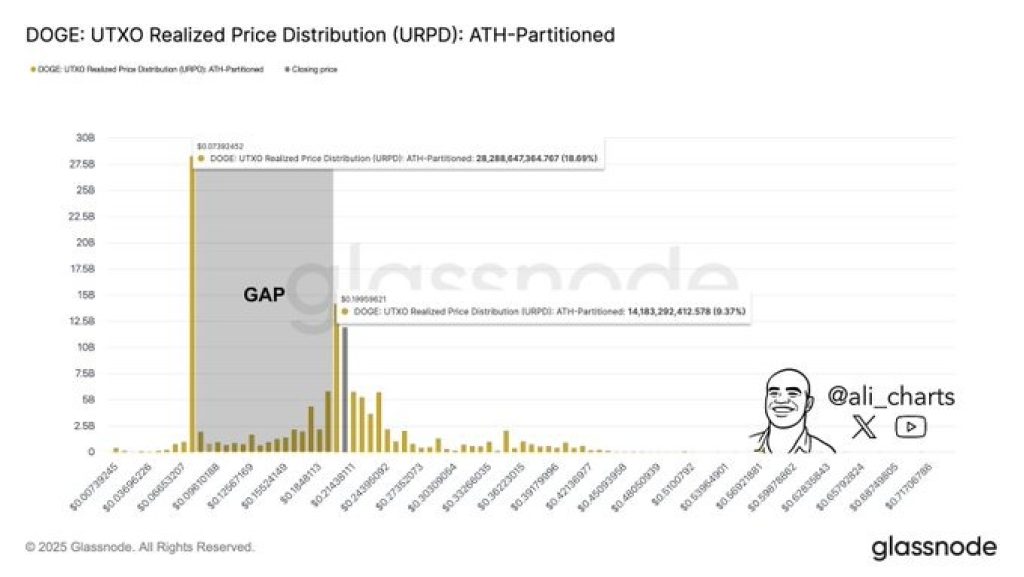 Dogecoin price might be getting ready for a big move, and according to analyst Ali, the chart is flashing something major. He pointed out a massive price gap between $0.07 and $0.19 on Dogecoin’s UTXO Realized Price Distribution (URPD) chart from Glassnode.