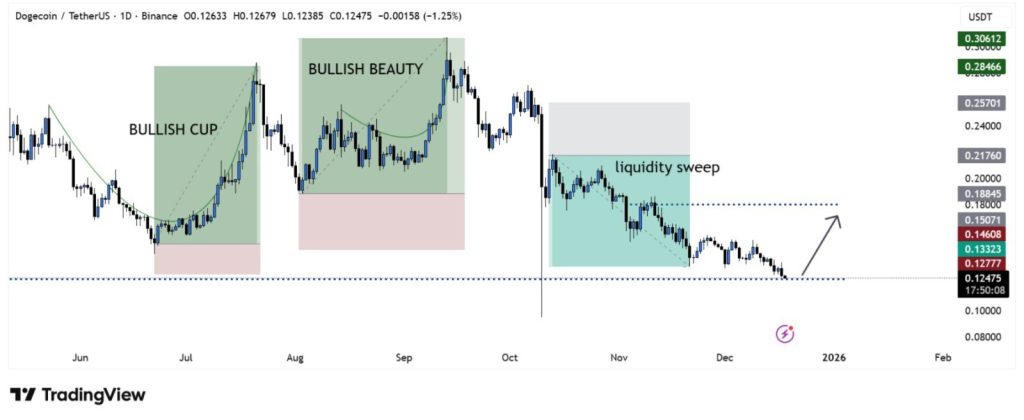 The Dogecoin price is now sitting in an area that has acted as a base several times before. This isn’t just another random level on the chart. It’s a zone where buyers have shown up in the past after similar pullbacks.