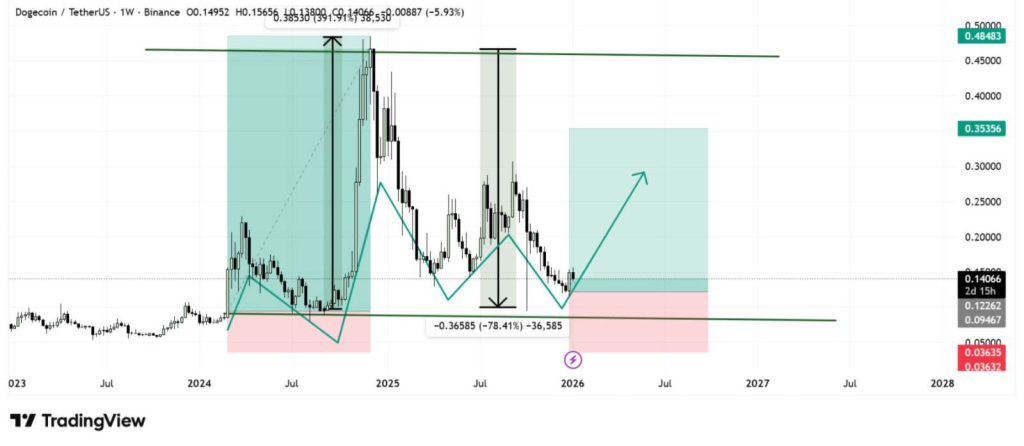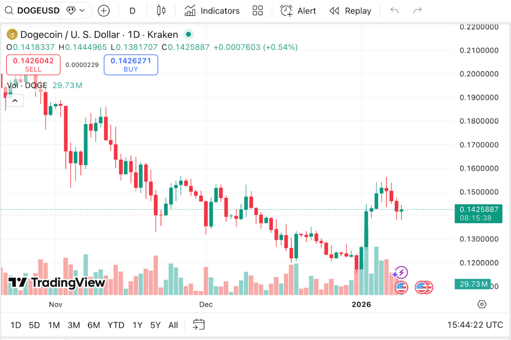 Dogecoin price prediction models are increasingly centered on consolidation rather than continuation of the selloff. DOGE is currently trading at $0.1425 following a significant loss of about 0.68% in the last 24 hours, with a market cap of about $23.49 billion, while trading volume has dropped to $1.18 billion, reflecting a significant loss of about 27.73% in activity.