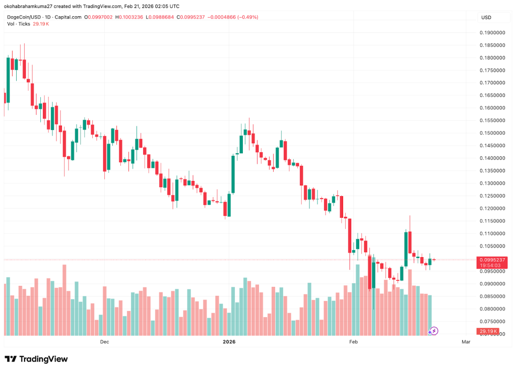 Dogecoin is currently trading at $0.1019 as of February 20th. It is weighed down heavily by a Fear & Greed Index score of 7, which indicates extreme fear. The Dogecoin market sentiment is very bearish, compounded by a very high volatility rate. Over the past thirty days, the meme coin has only had 10 green trading days.