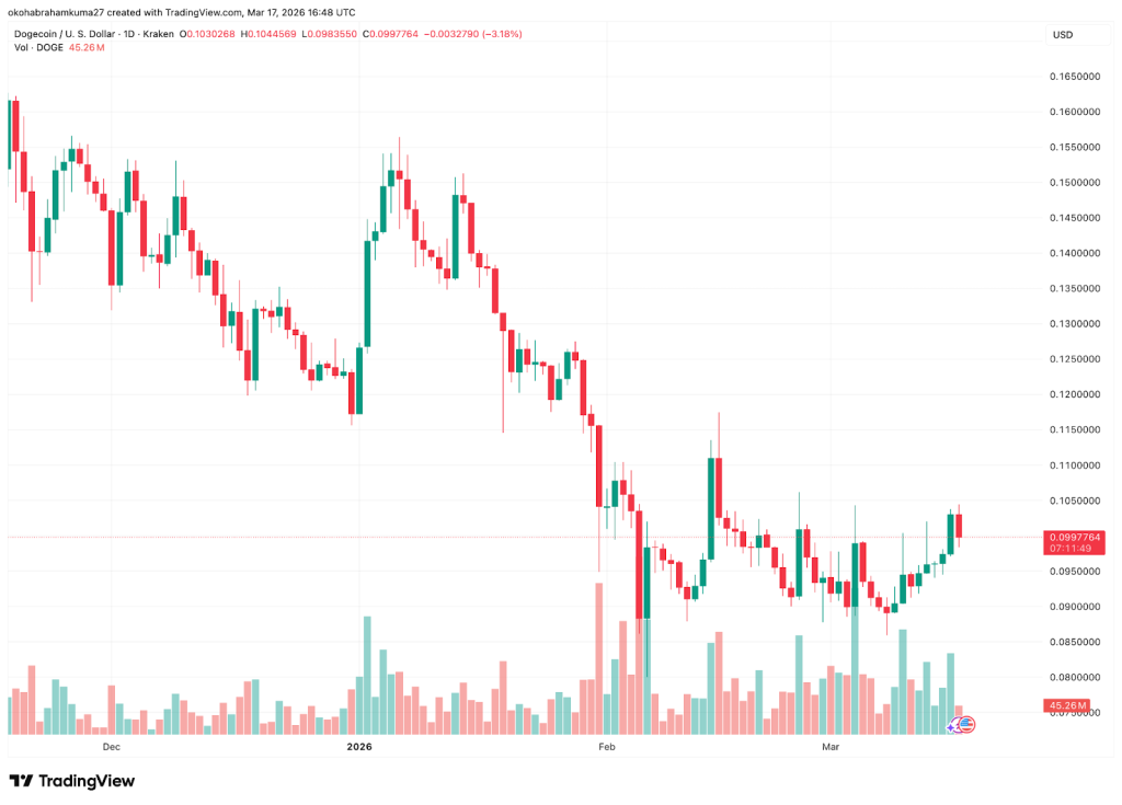Dogecoin had a 10% price increase on the weekly chart as of March 17th, but when you zoom out of the weekly chart, the excitement disappears fast. The most optimistic Dogecoin forecast 2026 doesn’t point anywhere near life-changing wealth.