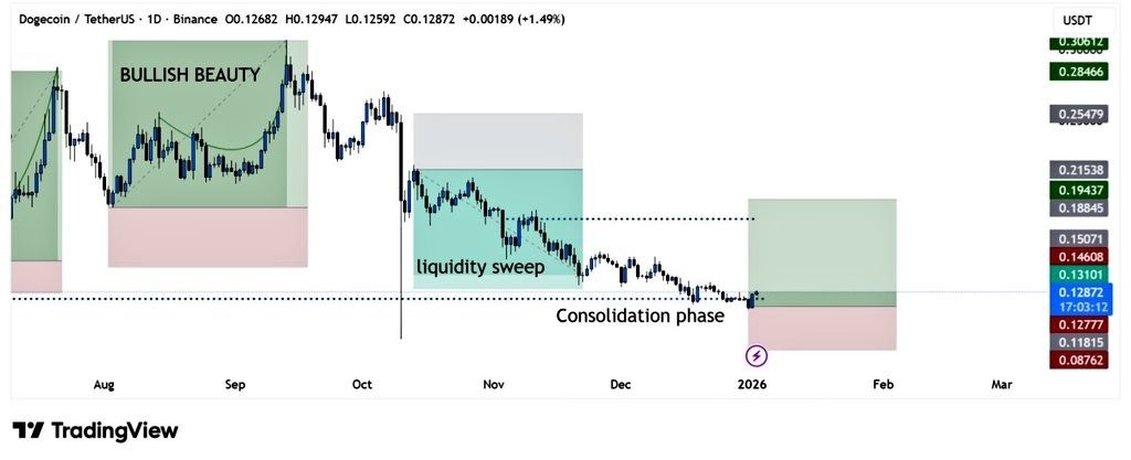 BitGuru pointed out that the DOGE price has already gone through a liquidity sweep and is now consolidating after a long downtrend. That change in behavior is important. Instead of pushing lower with force, price is holding steady, which usually signals that selling pressure is starting to dry up.