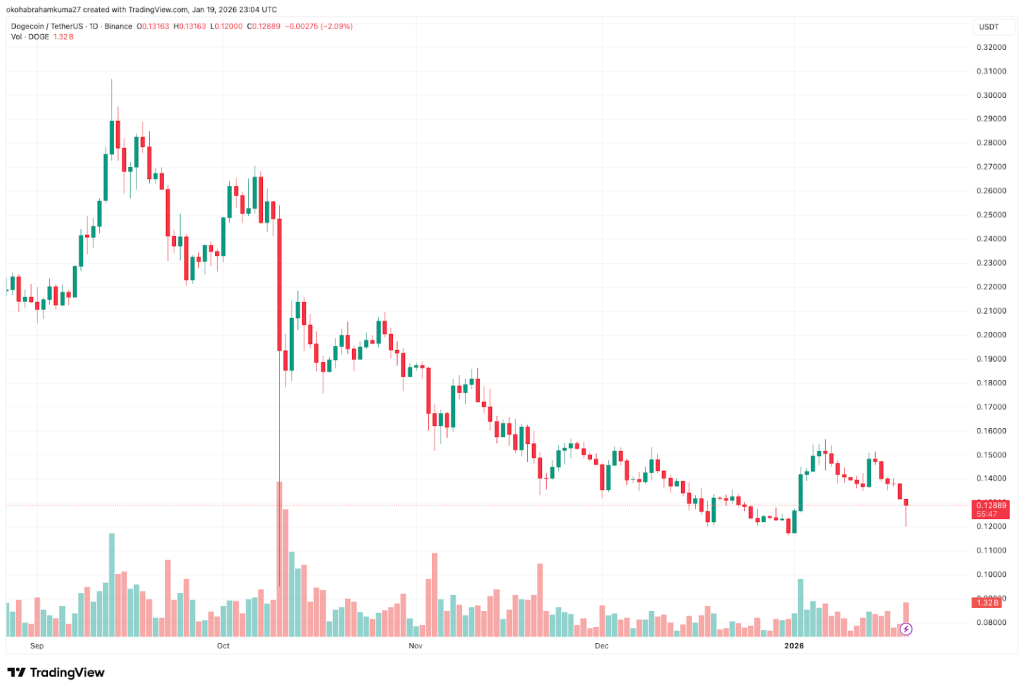 However, this volume has not translated into gains since the price has declined by 5% in the last seven days, underperforming the market. The Dogecoin price prediction suggests a 55% recovery to $0.1988 by January 2027. However, the Fear & Greed Index is at 44, and the Dogecoin market sentiment is bearish.