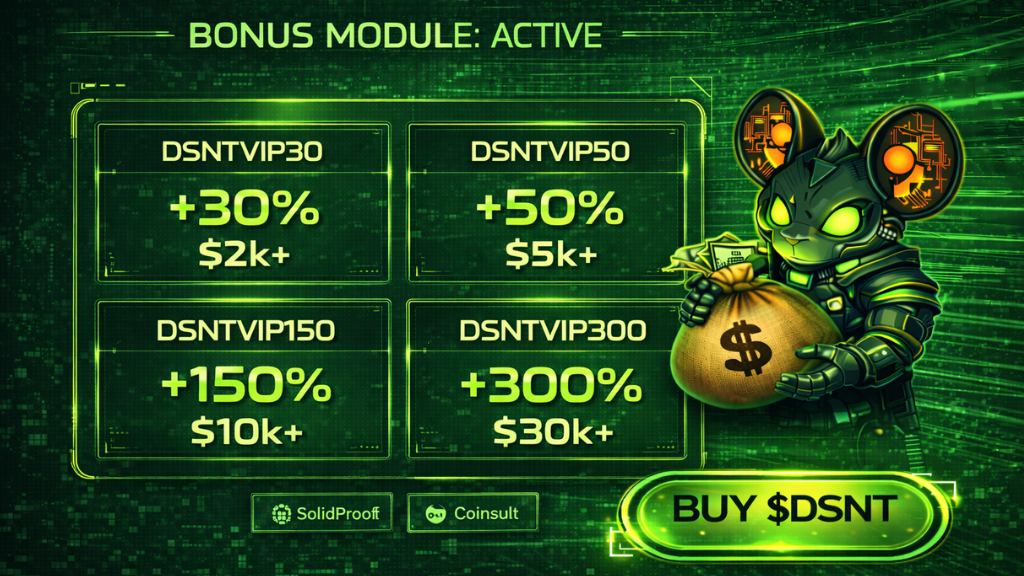 The platform’s utility is unmatched. SnitchGPT provides instant trading strategies, while SnitchFeed keeps you ahead of the news. This creates a sticky user base that drives long-term demand for the token. Furthermore, the project offers a massive passive income opportunity. More than 31 million tokens have been staked by the community. And now, there are discount codes for you to increase the size of your presale allocation. You can apply the code DSNTVIP30 for buys as small as $2,000 and DSNTVIP50 for buys of $5k and above for a 50% bonus.