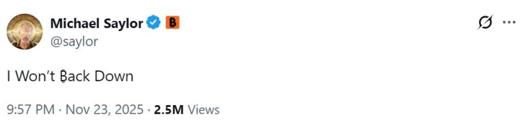Despite this, Strategy acquired another 8,178 BTC for $835.6 million on November 17, increasing its total holding to 649,870 BTC, valued at over $57 billion as of November 25. Chairman Michael Saylor reaffirmed his long-term convictions, stating publicly that he “won’t back down”.