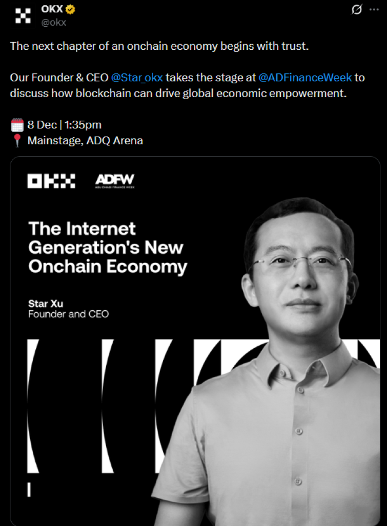 Speaking at Abu Dhabi Finance Week, OKX’s Star Xu projected that around 50% of the global financial activities could operate through blockchain in the coming decades.