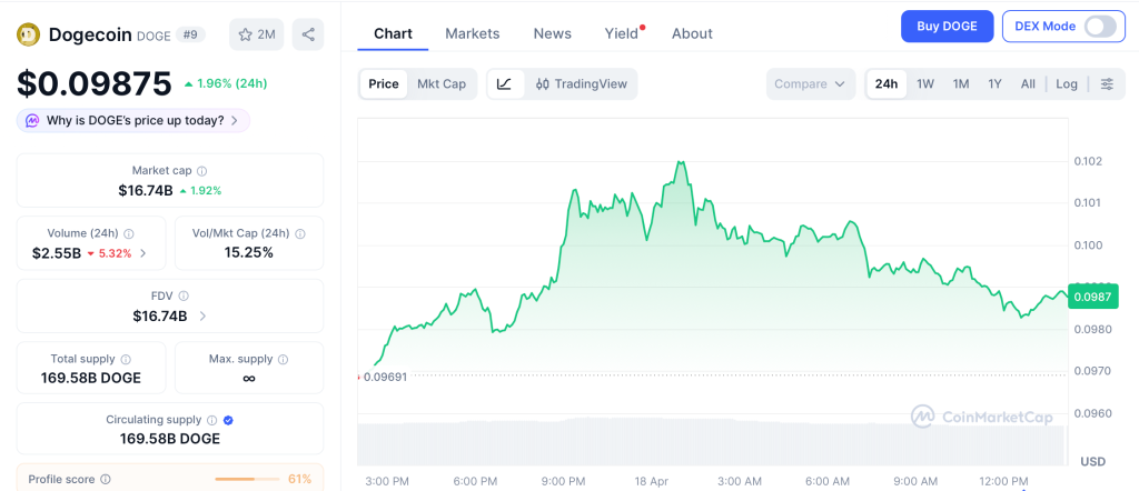 DOGE trades at $0.098 per CoinMarketCap, up 1.96% on the day as whales stack 330M tokens and options desks load up. Support sits at $0.092 with resistance right at $0.10, a level that cracks open the path to $0.13 fast if X Money drops any crypto surprise.
