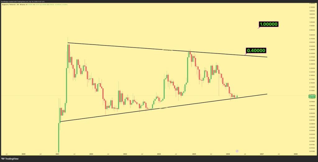 The risk is just as clear. If the support line breaks, the setup is invalid. Don Wedge states that directly. For this setup to remain valid, the support line must not be broken. A breakdown would send the DOGE price looking for new lows, and the entire multi-year pattern would be broken.