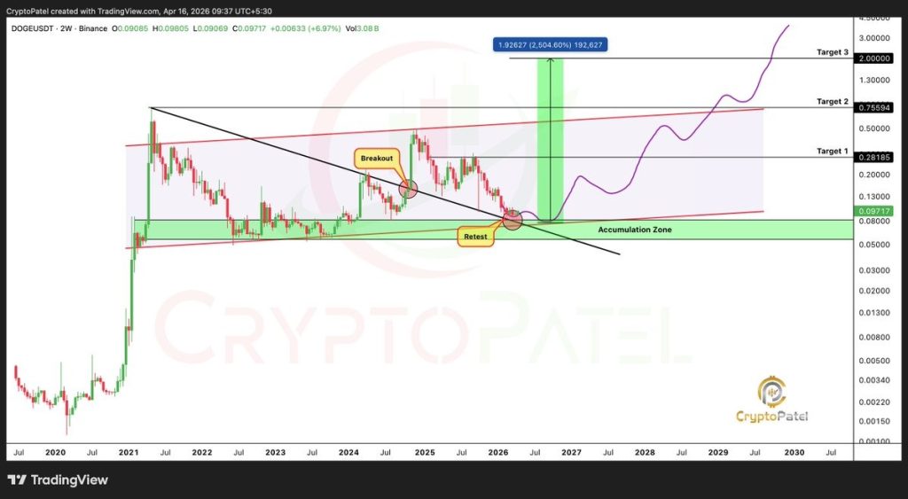 Looking at the chart from Crypto Patel, the long term structure is still intact. The DOGE price closed the latest week at $0.09717, up 6.97% on volume of 3.08 billion. The accumulation zone on Patel’s chart is marked between $0.09 and $0.07, and the DOGE price is sitting right inside it.