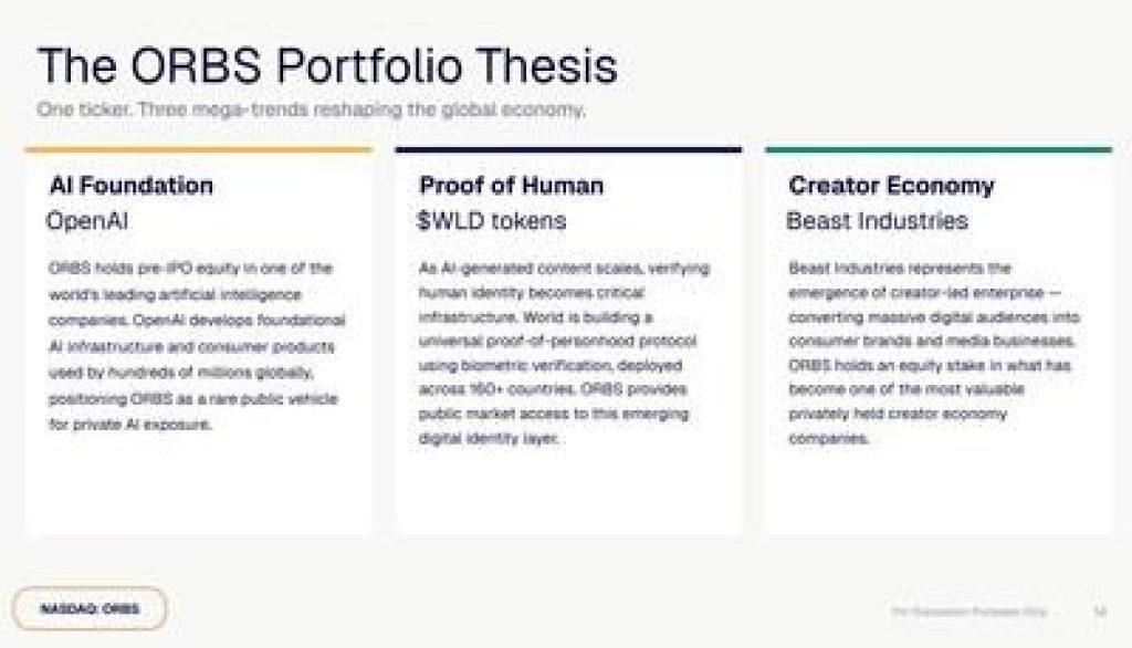 As of April 20, 2026, at 5:00 p.m. ET, ORBS’ holdings include a $90 million investment in OpenAI, a $25 million investment in Beast Industries, 283,452,700 Worldcoin (WLD) at $0.27 per WLD (per Coinbase), 11,068 Ethereum (ETH coins), and $118 million in total cash and stablecoins, for total holdings of approximately $336 million.