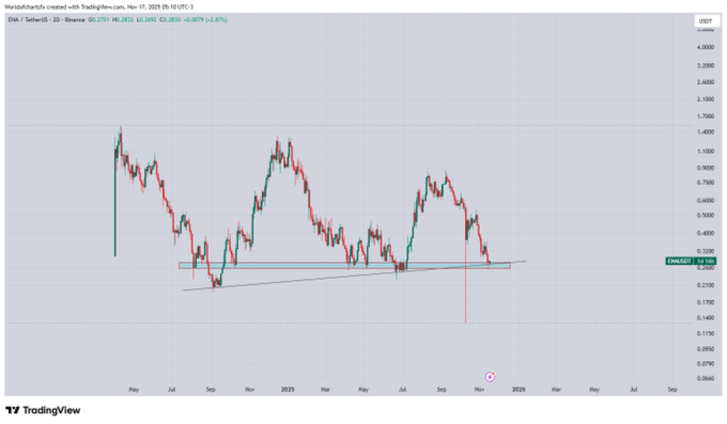 Top analyst WorldOfCharts pointed out that if ENA stays above this horizontal zone, the chances of a bounce improve. The trend hasn’t flipped bullish yet, but the bleeding has clearly slowed, and that’s an important shift after the non-stop downside we saw earlier.