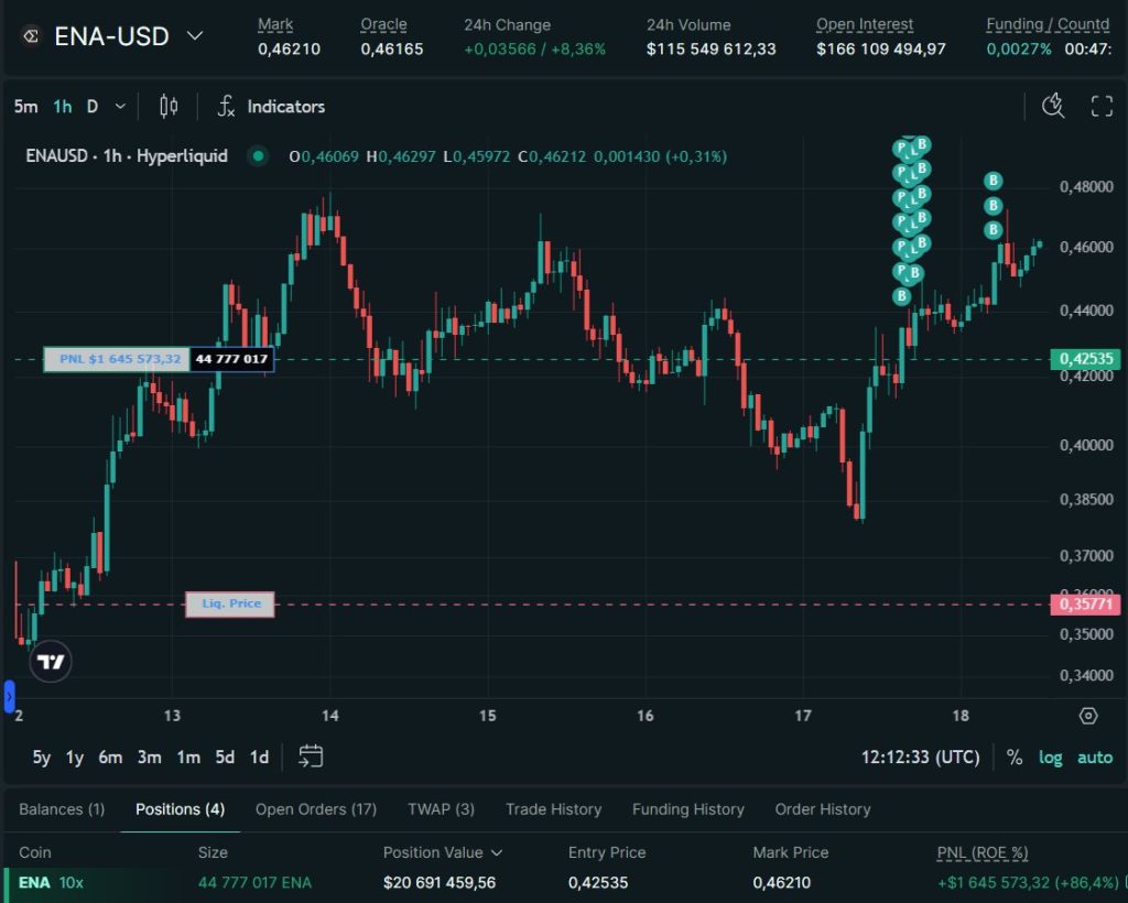 Right now, ENA price sits around $0.46, meaning the position is already up roughly 86% ROE. The liquidation line sits near $0.357, so there’s still plenty of room before things get risky.