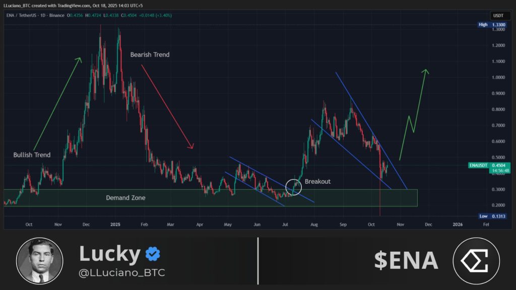 Crypto expert LLucianoBTC shared a daily ENA chart showing something pretty interesting, a falling-wedge breakout that could mark the end of ENA’s bearish trend. After months of drifting lower, ENA price found solid demand between $0.25-$0.35 and bounced hard.