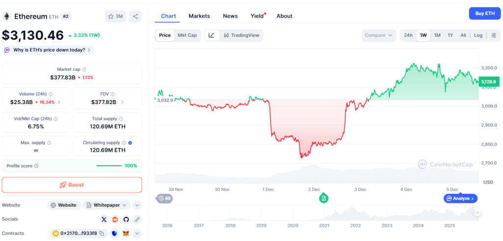According to CoinMarketCap, the Ethereum price has increased by 3.3% on the weekly chart. The price of Ethereum is yet to start a major rally following the recent Fusaka upgrade.