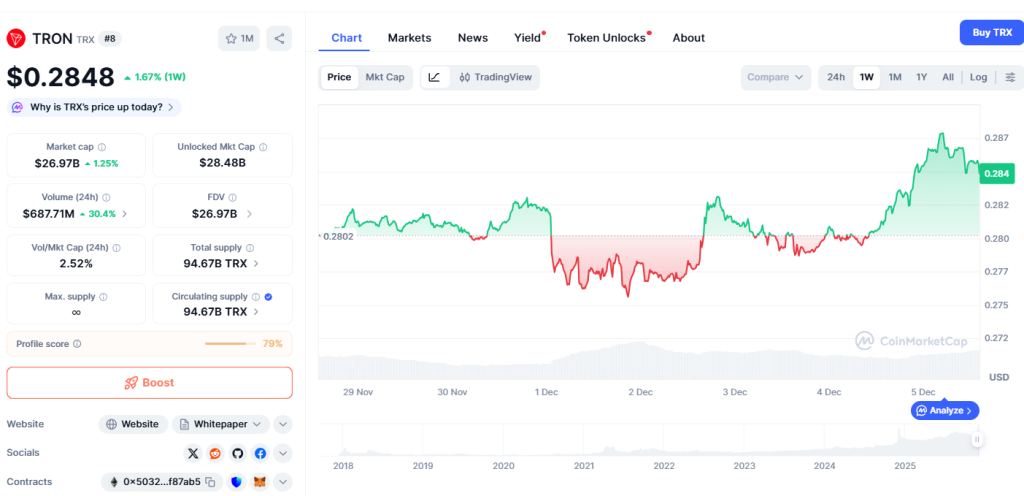 The Tron price has pushed into the $0.2850 zone, according to data from CoinMarketCap. Bulls are currently attempting to convert this former resistance zone into support.
