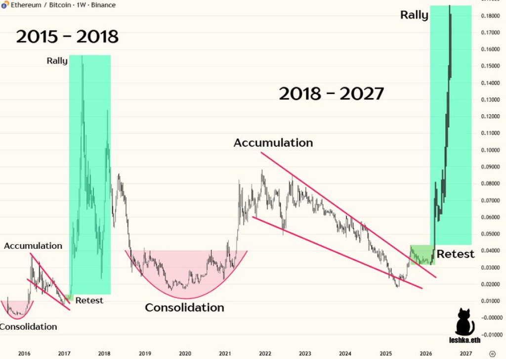 Ethereum price action during this consolidation looks ordinary on the surface. Zooming out tells a very different story. According to analyst Leshka.eth, the current ETH structure mirrors a historical pattern that once preceded an explosive rally. The chart shows a long accumulation phase followed by a clean breakout and retest. That same structure appeared years ago before Ethereum surged from $56 to $1,151.