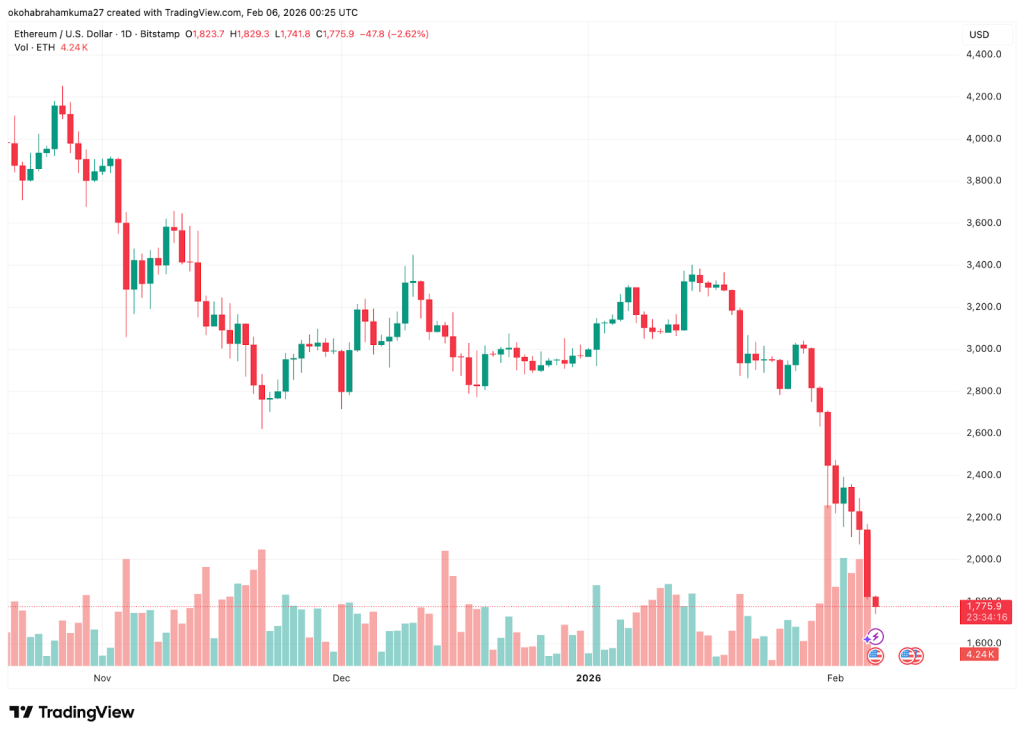 Ethereum news today shows a network under siege. The coin has declined by more than 31% in the last seven days as of February 5th, underperforming a global market that is down nearly 20%. Despite a 13% increase in trading volume, likely driven by selling pressure, the price remains depressed.