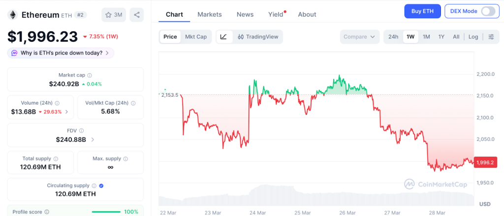 ETH trades at $1,996 with $56 billion in total value locked and hosts over half the world’s stablecoins and tokenized assets according to CoinMarketCap
