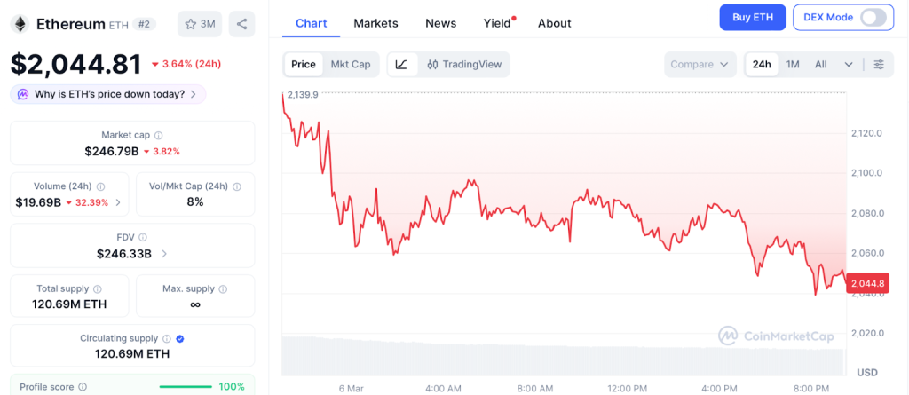 ETH trades near $2,044 according to CoinMarketCap during consolidation with exchange supply hitting decade lows and Standard Chartered projecting $40,000 by decade end.