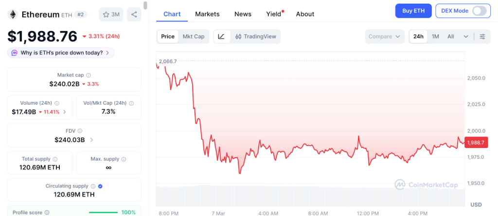 ETH trades near $1,988 according to CoinMarketCap after correcting from $3,200 with the Fusaka upgrade approaching. Standard Chartered raised its target to $7,500, Tom Lee projects $7,000 to $9,000, and Arthur Hayes targets $10,000.