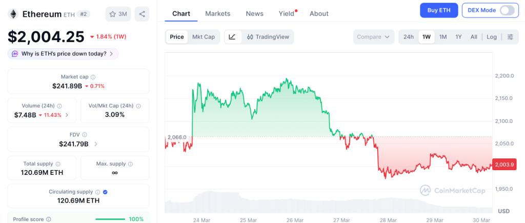 ETH trades near $2,004 after dropping 1.84% this week according to CoinMarketCap, with the Fear and Greed Index at 9 and spot ETFs bleeding $391 million across seven consecutive outflow days.