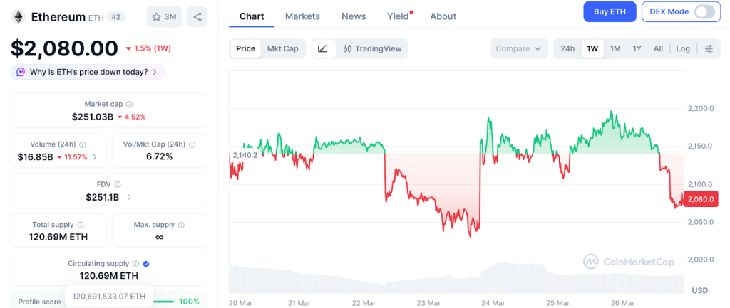 Ethereum trades at $2,080 after breaking below its short term trend line, according to CoinMarketCap. The 50 day EMA acts as resistance above $2,100. Bitmine buying 65,341 ETH last week adds demand, and the Glamsterdam upgrade targeting May 2026 brings a major protocol improvement.