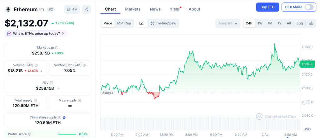 Ethereum trades near $2,132 as of April 1 according to CoinMarketCap, with Lido TVL at $32.1B and DeFi lending rates on the rise.