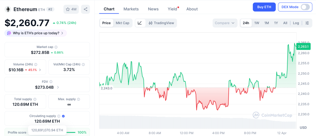 Ethereum (ETH) trades at $2,260 per CoinMarketCap, up 0.74% on the day as Q1 user growth hit 82% and BlackRock’s ETHA sustained 22 straight days of inflows.