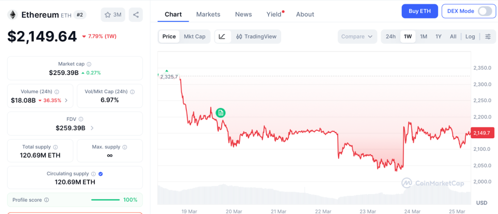 Ethereum trades near $2,149 as of March 24 with BlackRock’s ETHB staked ETF crossing $254 million in two weeks, according to CoinMarketCap. The token recovered 5% on the week with RSI near 50 flashing buy signals.