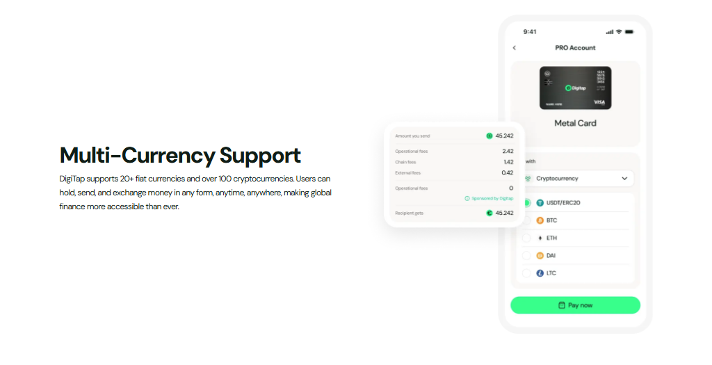 With its transformative omnibank solutions, Digitap brings everyday banking and digital assets together in one place. Users can manage multiple currencies, send money across borders, set up savings, and spend directly using a built-in Visa debit card. Everything works inside a single app, removing the need to juggle multiple platforms.