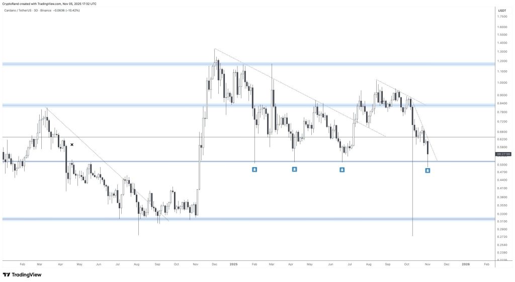 On Crypto Rand’s chart, every time the ADA price dropped into this zone over the past year, buyers stepped up.