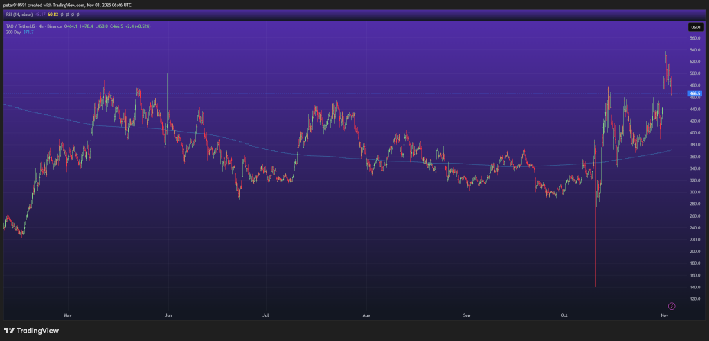 The TAO price remains in a strong long-term uptrend, even with the recent pullback after touching the $550 area. That move created a quick local top before sellers stepped in. The good news: price is still trading comfortably above the 200-day moving average (around $370), which keeps the bullish structure fully intact.