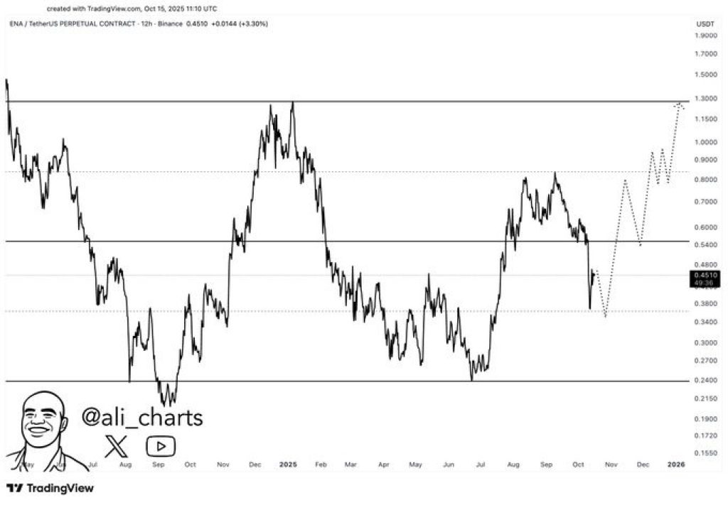 Ali’s chart shows a clean shift in structure. ENA has been trapped in a downtrend for months, forming lower highs and lower lows.