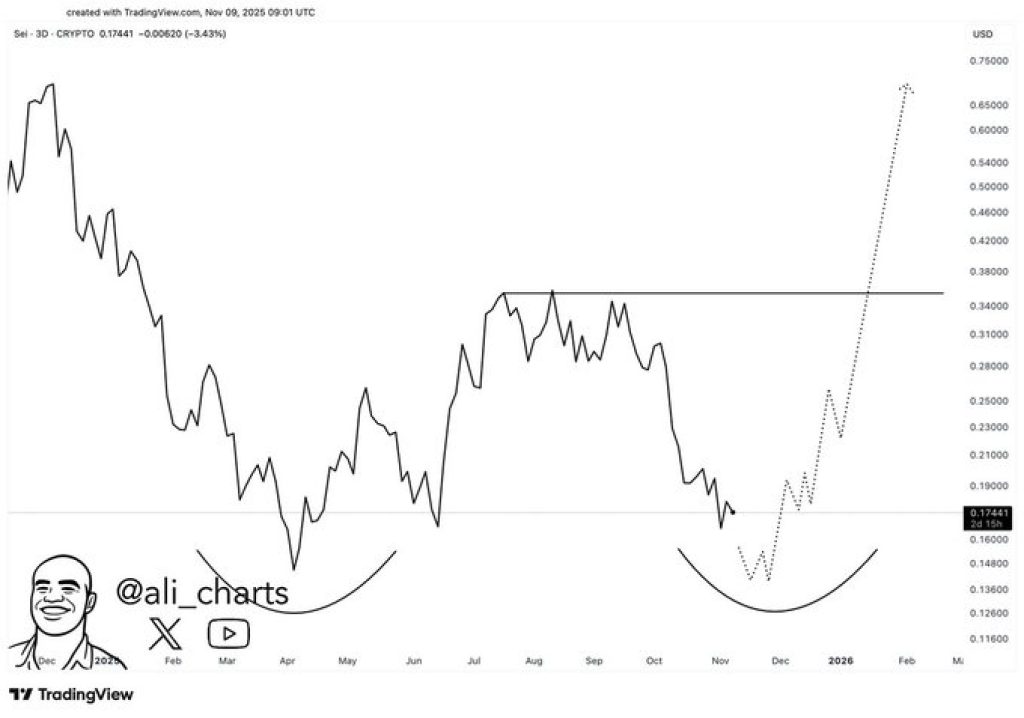 And according to market analyst Ali, this setup could become something much bigger. He believes SEI may be forming a clean double-bottom pattern, one that points toward a breakout that could push the price all the way to the $0.70 region. That would mean a move of more than 400% from current levels.
