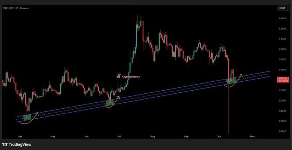 Batman also mentioned the “Trump tariff abnormal candle”, that wild, short-lived wick caused by panic selling during the market crash. When you take that candle out of the equation, XRP’s chart looks much cleaner.