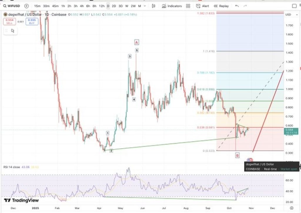 If Dogwifhat price can move above that and close convincingly, the pattern disappears with the path opening towards much higher targets, potentially reaching the full 100% extension of the previous A-wave near $1.41. Until that level breaks, the price remains pinned under short-term resistance.