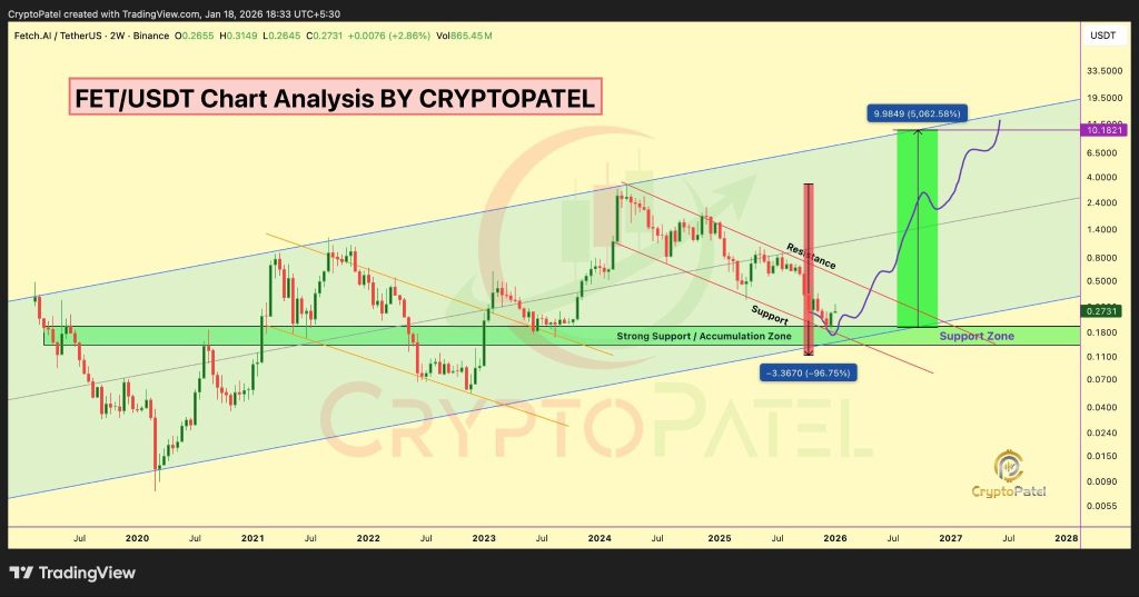 When you look at the higher time frame chart shared by Patel, FET has been moving inside a broad ascending channel that’s been respected all the way since 2020. That alone already says a lot.