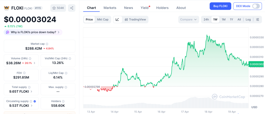 Floki (FLOKI) trades near $0.000030 after jumping roughly 11% in 24 hours on the Bitcoin breakout, according to CoinMarketCap. The token still sits 91% below its $0.0003462 all-time high from June 2024 with a $308 million market cap.