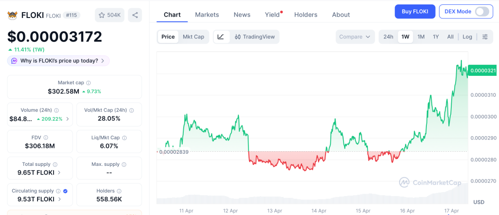 FLOKI trades near $0.000031 on April 17, sitting roughly 91% below its all time high of $0.0003462 according to CoinMarketCap data.