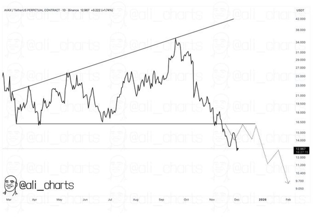 The next few weeks depend heavily on how AVAX behaves around the $12 support. If it fails to hold, a move toward $10 becomes very likely, and the $9 target mentioned by Ali comes into play shortly after. This would simply extend the downtrend already in motion.